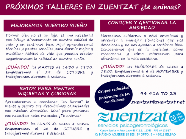 Después del verano, en ZUENTZAT volvemos al curso con nuevos talleres prácticos y adaptados a tus necesidades. Para empezar, tienes varios para elegir, ¿cuál es el tuyo? : » Mejoremos nuestro sueño»: ¿crees que la calidad de tu sueño es mejorable? ¿quieres dormir mejor cuidando tus hábitos cotidianos? Aquí aprenderemos pautas y técnicas sencillas que pueden…